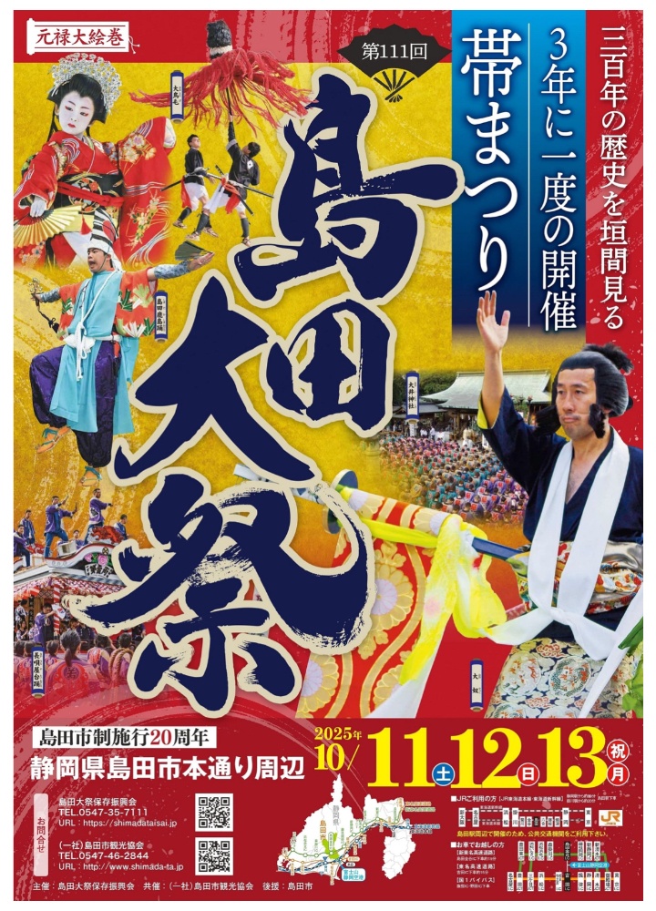 3年に1度、10月中旬に開催される島田大祭。大井川鎮護や安産の神として信仰されている大井神社の祭りで、1695年(元禄8年)に神事祭式が定まり、初めて神輿が渡御(とぎょ)されてから令和7年で111回を数えます。当初の供奉(ぐぶ)の行列は、神輿の他に代官をはじめ宿役人、一般の宿民が続き、鹿島踊りや大奴もこの時代から加わっていました。
